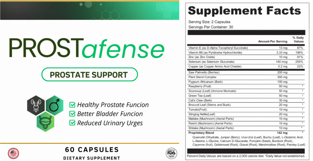 Prostafense is a dietary supplement designed to support prostate health and promote men’s overall well-being in a natural and safe way. It’s made with carefully selected, all-natural ingredients that work synergistically to improve urinary comfort, reduce nighttime awakenings, and help maintain healthy prostate function over the years.